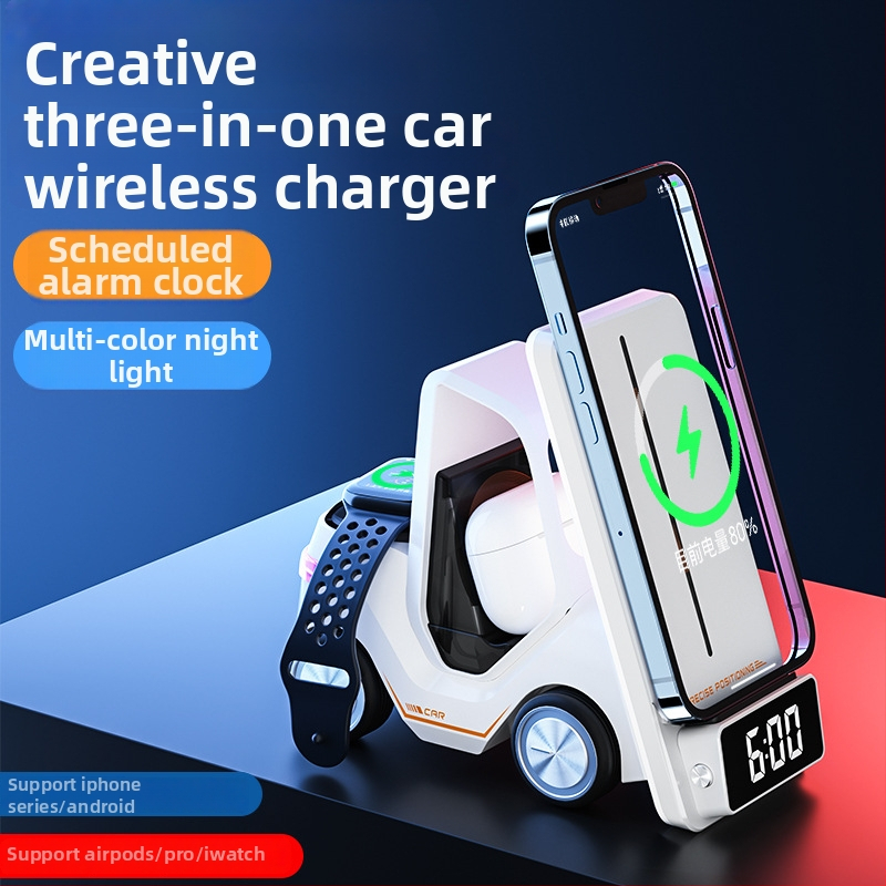 Încărcător wireless de birou în formă de mașină, 3 în 1 pentru ceas inteligent și căști wireless, 15W ieșire, QC3.0, încărcare magnetică, afișaj digital