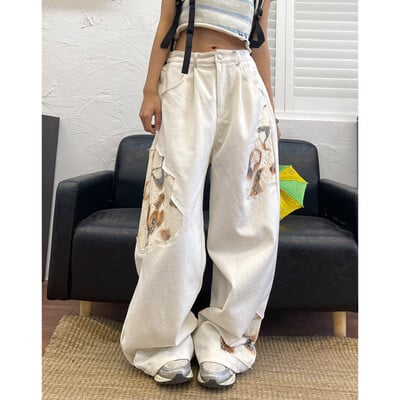 • Blugi albi pentru femei cu talie înaltă Hip-hop cu îmbinare la modă Vintage Streetwear Y2K Jean cu picioare largi 2024 Pantaloni pentru femeie Pantaloni largi din denim