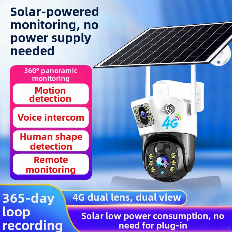 Cameră solară 4G/WiFi cu obiectiv simplu sau dublu, HD impermeabilă pentru exterior, monitorizare la distanță, 0.02 lux iluminare minimă, SNR > 48 dB, alimentare 5V