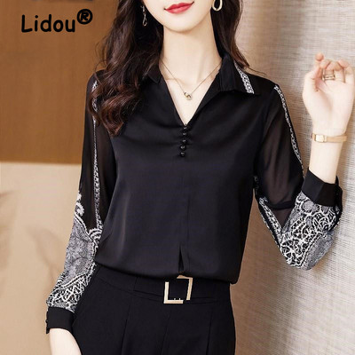Elegant, chic, cu mărgele, design de lux, imprimeu, birou, cămașă cu nasturi, primăvară, toamnă, femei, cu decolteu în V, cu mâneci lungi, bluze, bluze