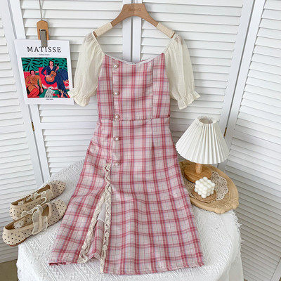 Rochie casual in carouri model nou cu crapatura si decolteu barca