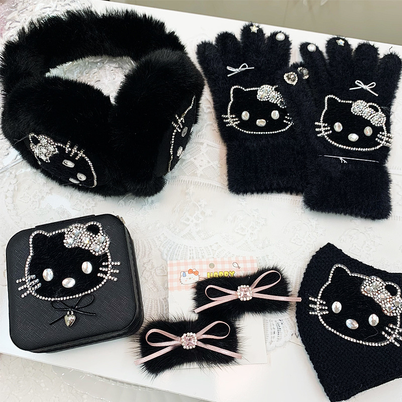 Set de accesorii de iarnă cu cutie pentru bijuterii: model pisică desen animat, blană de iepure artificială, mănuși pliabile, protecții pentru urechi și mască de călătorie