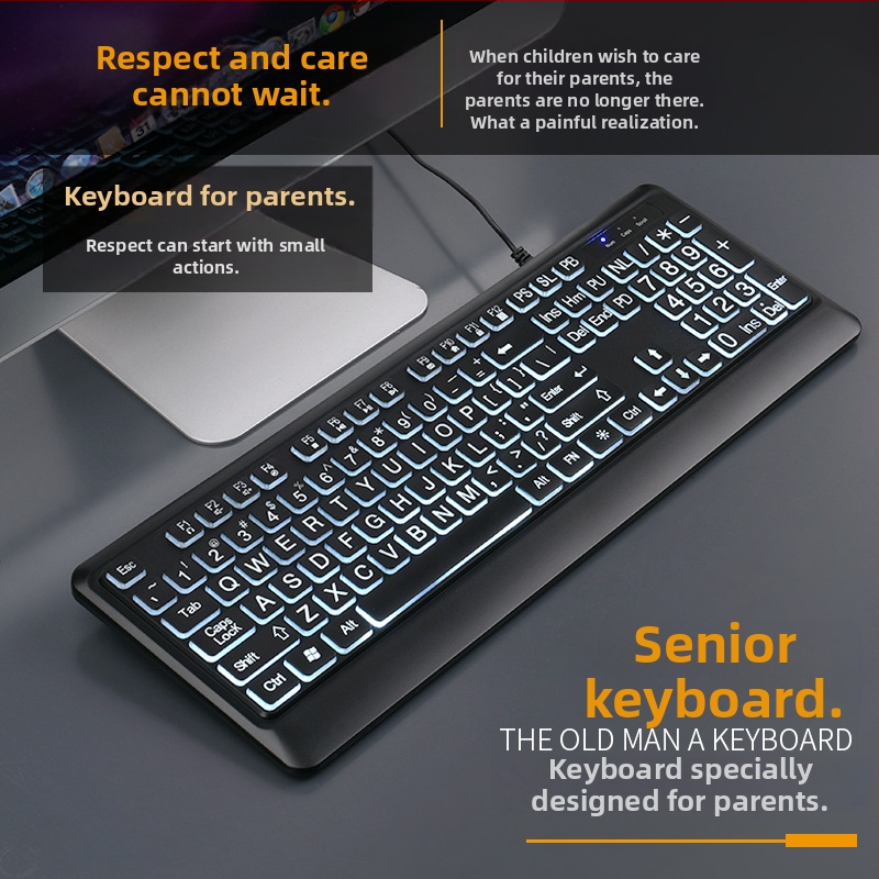 Tastatură multimedia pentru vârstnici, caractere mari iluminate și Pinyin, 104 taste, cablată, impermeabilă, Crater Architecture tehnologie